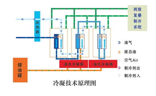 利用VOCs氣體中不同有機組分在不同溫度下具有不同的飽和蒸汽壓這一性質(zhì),通過制冷機組逐級降低系統(tǒng)溫度,使油氣中的一些烴類物質(zhì)的蒸汽壓達到過飽和狀態(tài),過飽和的蒸汽逐步冷凝成液態(tài)并加以收集,達到回收油品,凈化氣體的目的。采用多級冷凝技術(shù),可通過三級冷凝將系統(tǒng)溫度降到-75℃,通常使用在有機氣體濃度較高場合,回收效果直觀、工藝成熟。